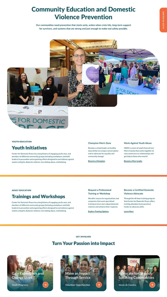The Center for Domestic Peace faced a structural challenge common to many mission-driven organizations: balancing the visibility of its community education and prevention initiatives with clear access to programs and services. The website needed to communicate the organization’s leadership in domestic violence prevention while ensuring that individuals seeking support could easily navigate available resources.