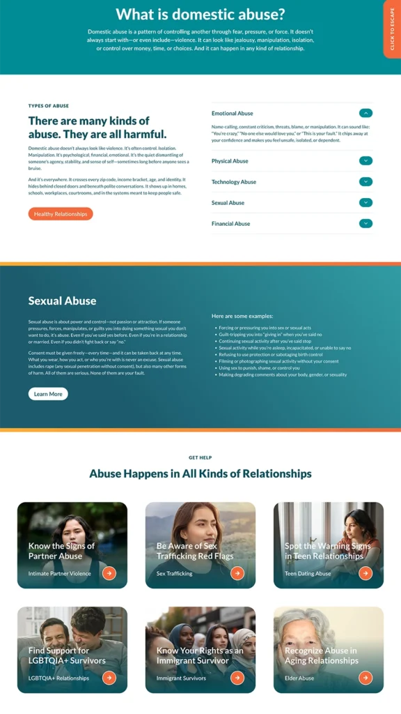 This balance became particularly important in shaping the site’s information architecture. Rather than framing all content around crisis response, the experience introduced an Understanding Abuse section to help individuals and their family members recognize the signs of unhealthy or abusive relationships, creating space for awareness and self-recognition. In parallel, a dedicated Get Involved section elevated opportunities for community engagement and prevention education. The result required careful navigation and content strategy decisions to maintain clarity, cohesion, and purpose across the site.