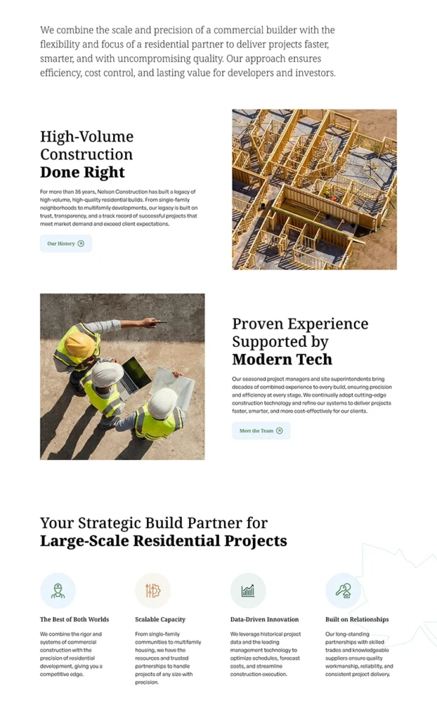 At the same time, content clearly communicates the flexibility of Nelson Construction’s offerings, from collaborating on a single phase of a project to delivering turnkey solutions from start to finish. This approach positions the company as both highly capable and adaptable, supporting search performance while reinforcing credibility and partnership potential.
